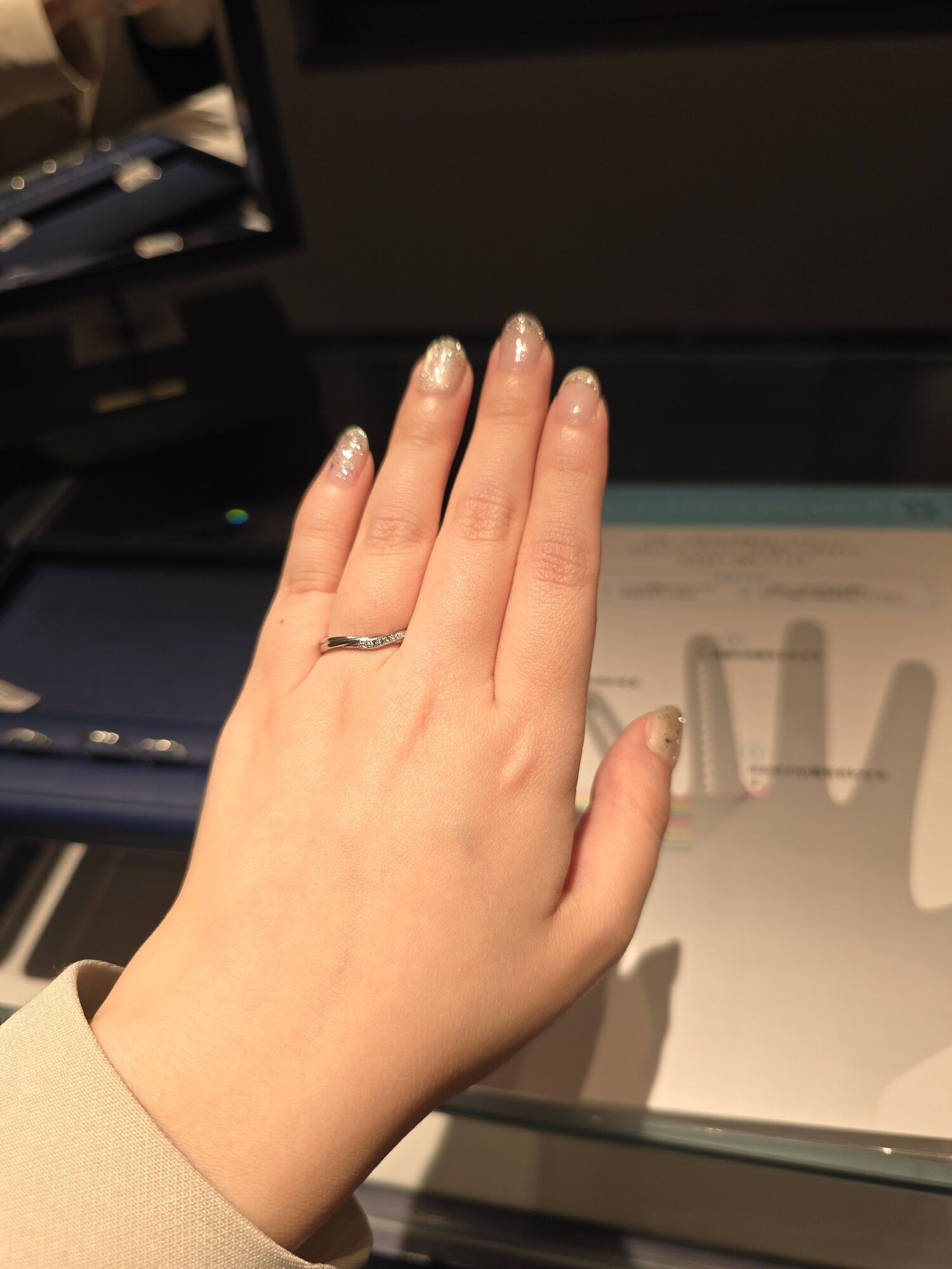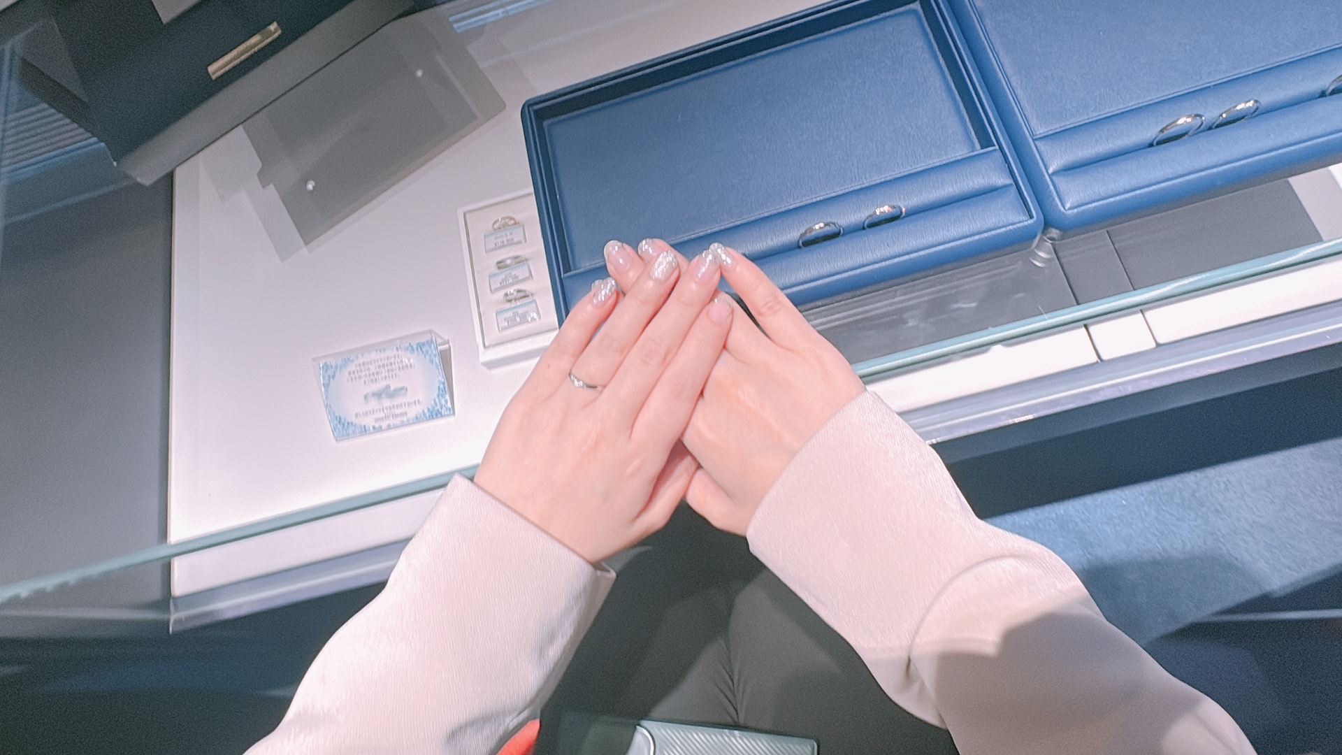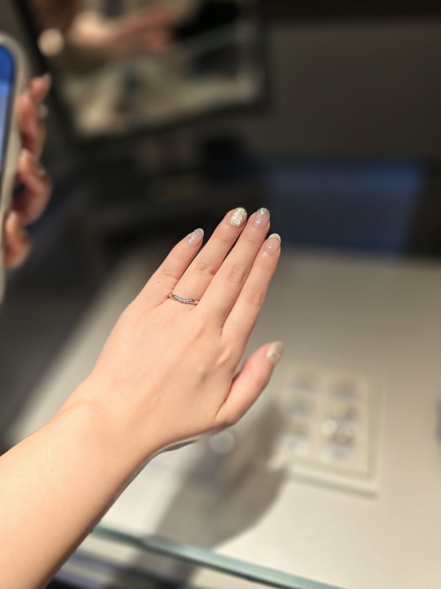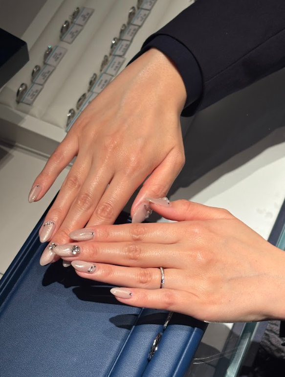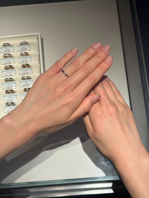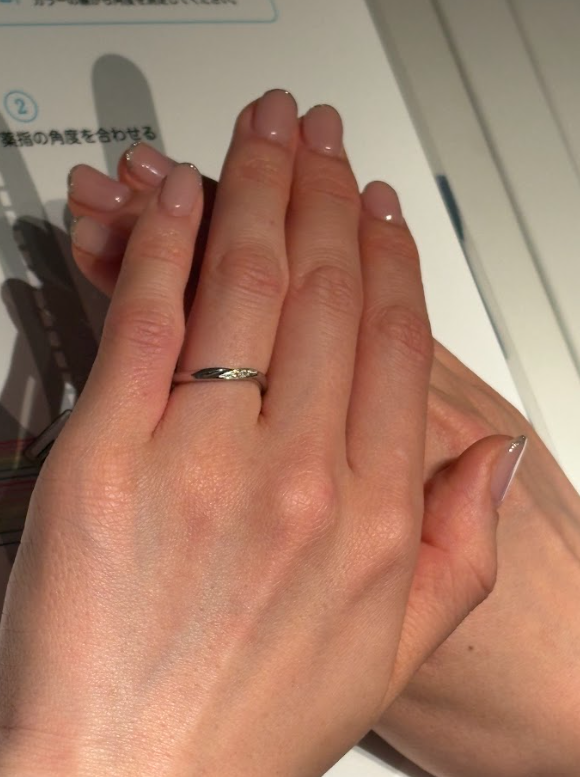 Pさん「かわいい!自分の指が長く見えますね。指が短く見えるのが悩みだったのですが、自分の指の根本まで指輪が入るとこんなに違うんだ...」
