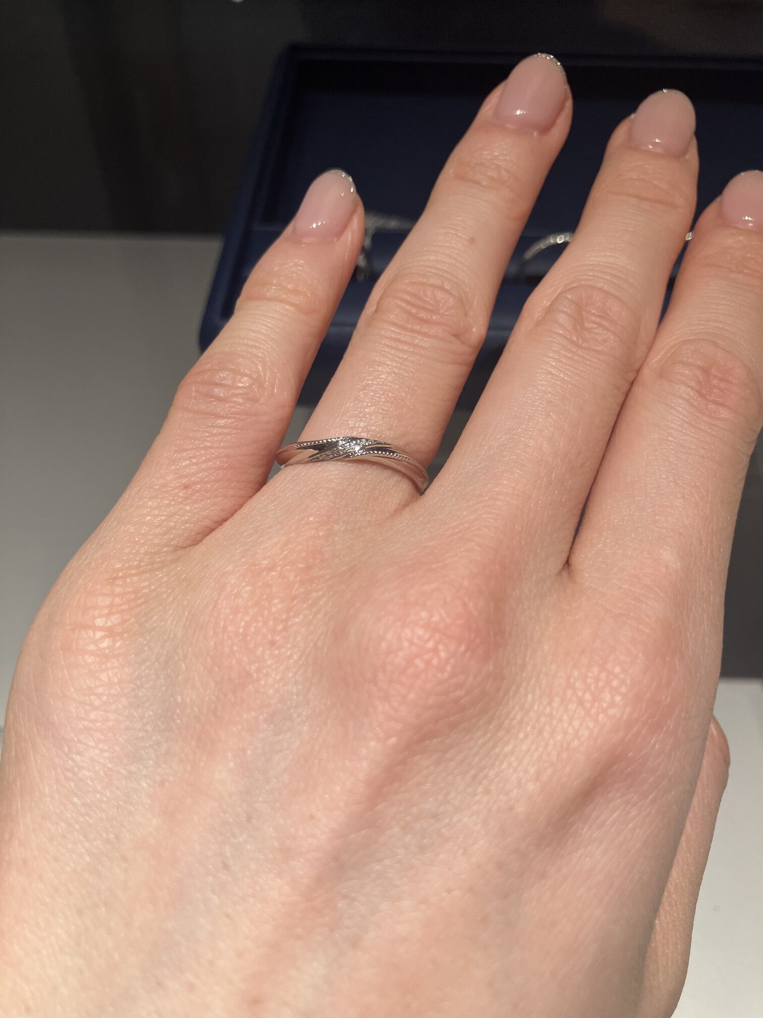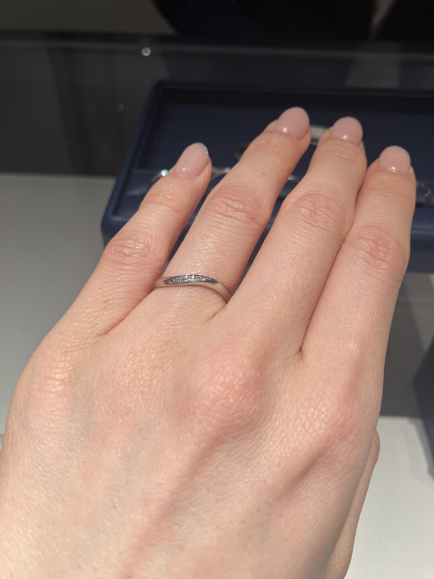 Pさん「先ほどの指輪と雰囲気が違う!ダイヤが煌めいていて上品。やはりこちらも一番最初の指輪よりも指が長く見えますね。HPでみたときはダイヤは少なくても良いと思いましたが実物をみると結構ダイヤが入っていても素敵って思いました。」